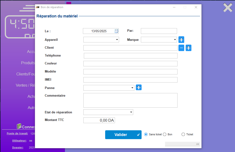 Enregistrement rapide des téléphones à réparer (marque, modèle, IMEI, client)